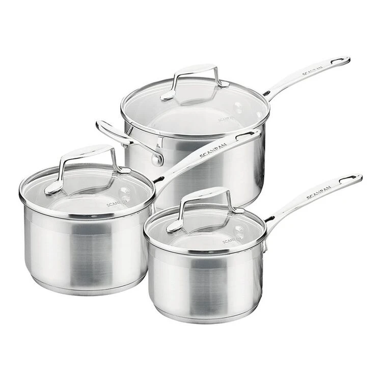 If you are looking for a quality cookware at an affordable price, this classic Stainless Steel Cookset will not disappoint. With a thick impact bonded steel-clad base with a 5mm aluminium core, the Scanpan Impact range heats up quickly and the heat is dispersed throughout the entire pan, allowing for perfect results.